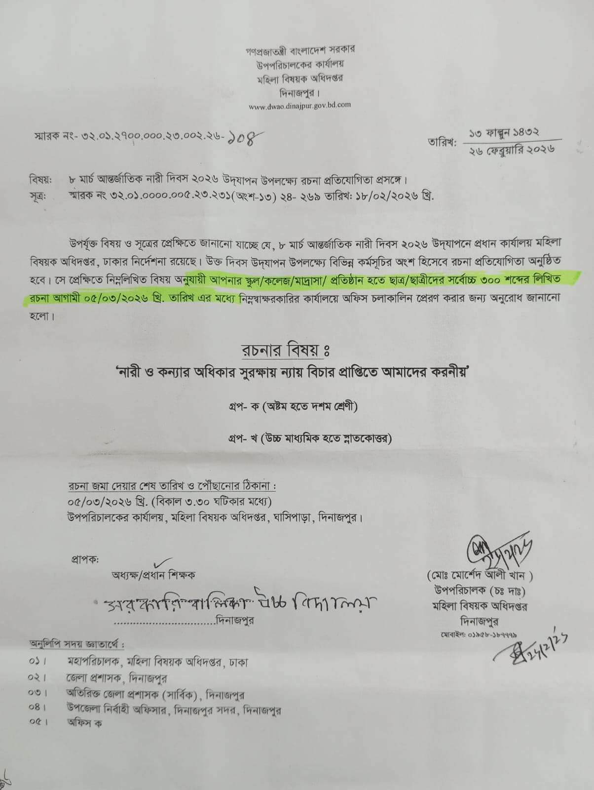 ৮ মার্চ আন্তর্জাতিক নারী দিবস ২০২৬ উদযাপন উপলক্ষে রচনা প্রতিযোগিতা প্রসঙ্গে।